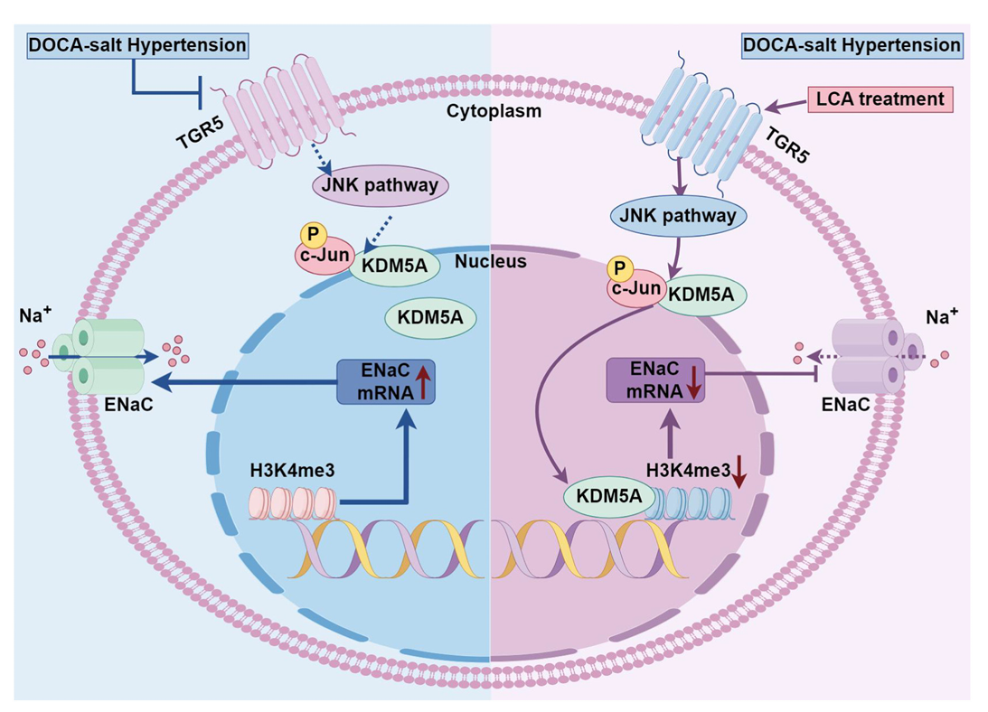 在DOCA-盐诱导的高血压小鼠,内源性或外源性TGR5受体激动剂石胆酸或INT-777显著降低血压水平,降低肾脏ENaC蛋白和基因表达;TGR5基因敲除明显增加DOCA-盐小鼠血压及肾脏ENaC表达。在肾脏皮质集合管mpkCCD细胞,TGR5受体激活显著抑制醛固酮诱导的ENaC介导的钠内流,降低ENaC蛋白和基因表达。通过对染色体修饰的数据分析,发现ENaC基因转录起始部位存在组蛋白H3第四位赖氨酸的三甲基化(H3K4me3)修饰,ChIP-seq分析及分子生物学实验显示DOCA-盐小鼠肾脏ENaC基因存在H3K4me3富集,而TGR5激活显著逆转这种富集。进一步的研究表明TGR5激活明显降低肾脏组蛋白去甲基酶5A(KDM5A)的表达和活性,提示TGR5可能是通过影响组蛋白去甲基酶5A参与调节ENaC的转录和翻译,从而调节肾脏钠的重吸收,进而影响血压。